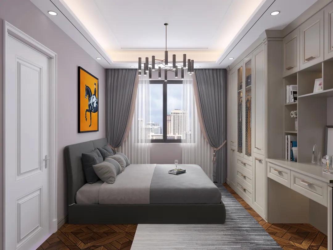次臥二 簡潔但又不缺構(gòu)造的美感,精巧優(yōu)雅的線條,仿佛藏著很強(qiáng)的韻律,不拘一格又讓人身心舒適。墻畫的點(diǎn)綴恰到好處,衣柜上下分層,上層為可視區(qū)域非常便利,下層儲納區(qū)域空間充足。