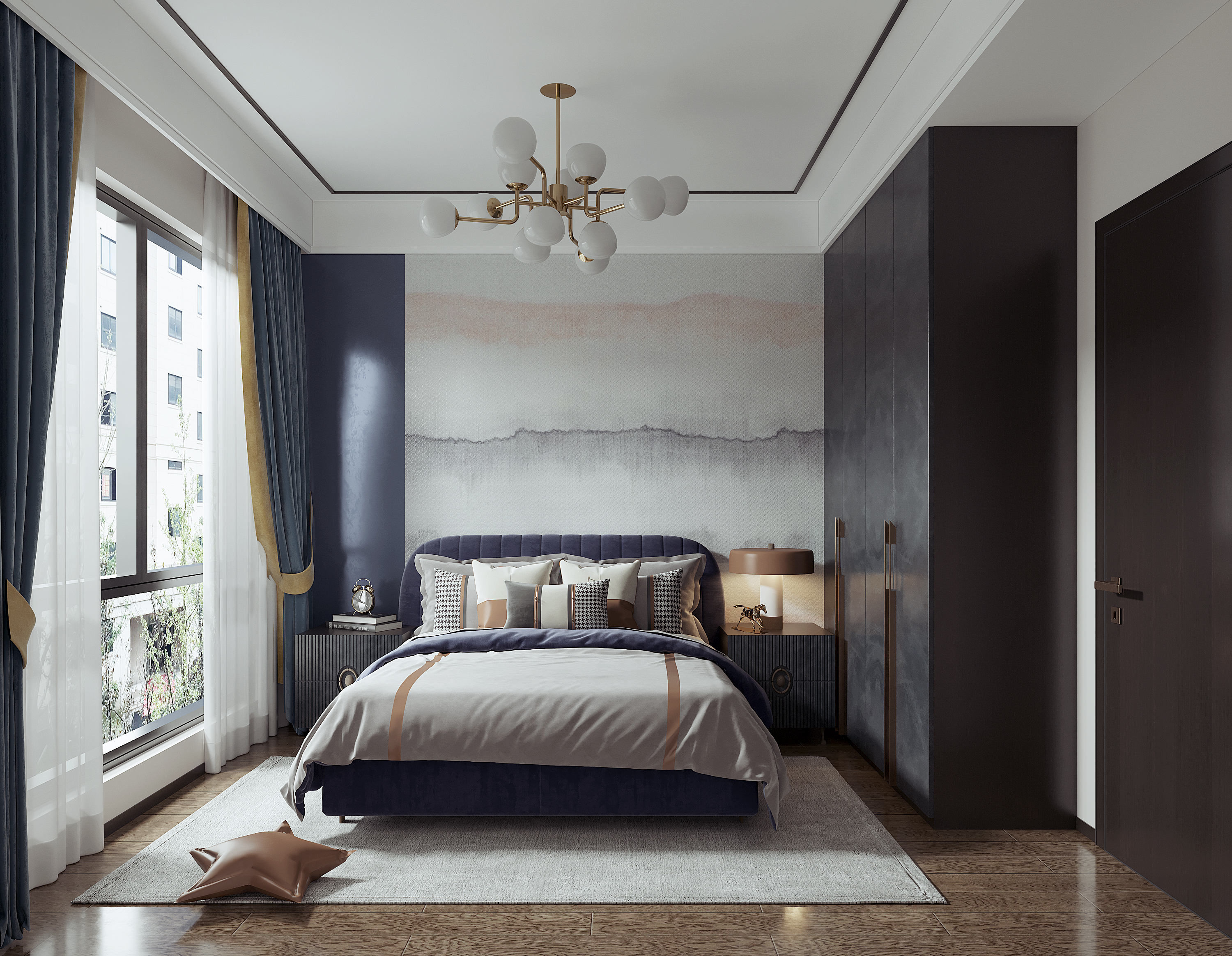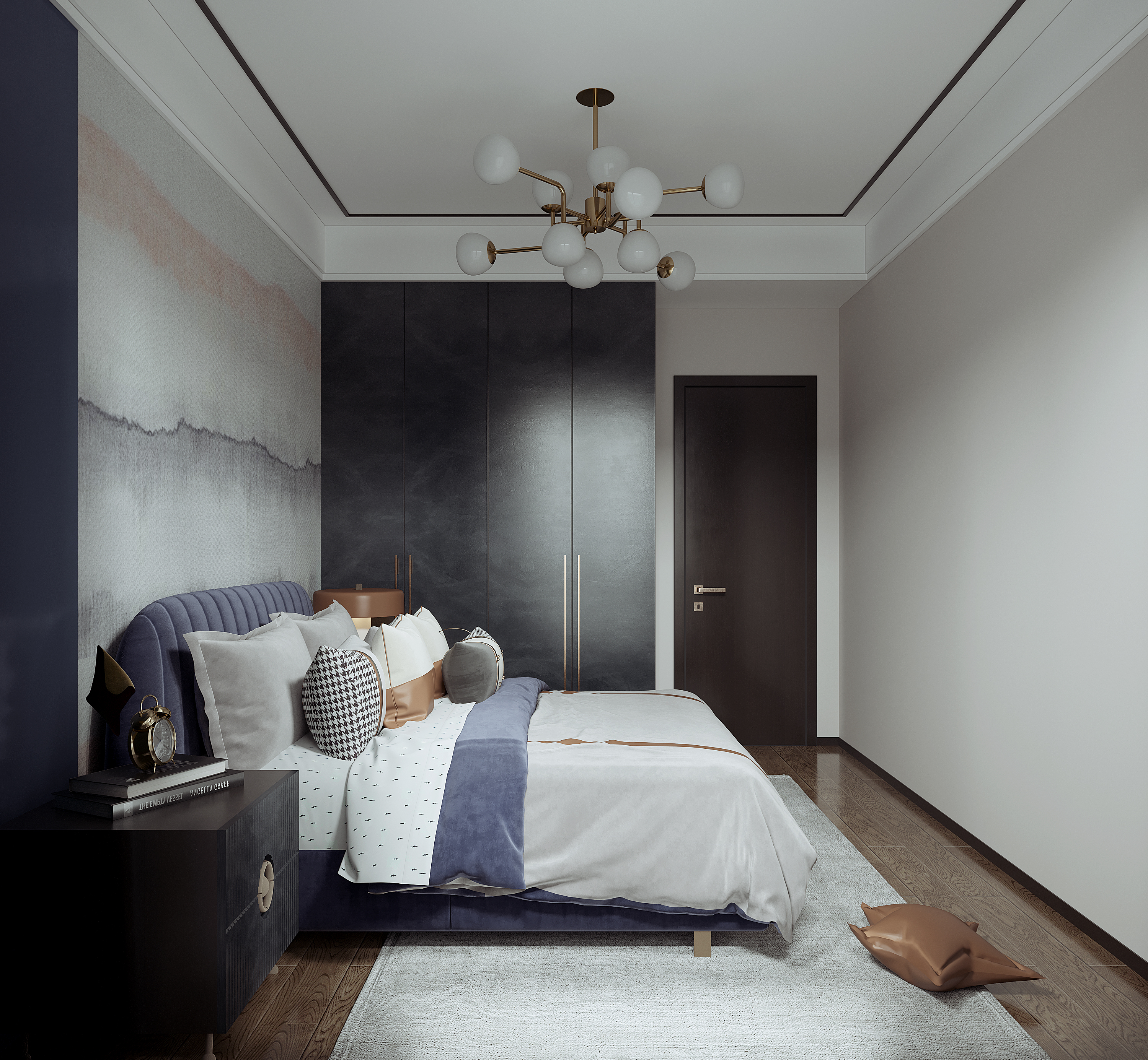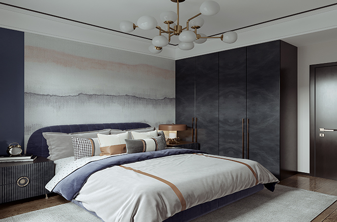 一門到頂的靠墻衣柜設計,柜體使用大面積玄武巖花色,與床頭背景墻的古典相映得彰,簡潔有力的空間,營造雅致、舒適氛圍。